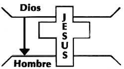"Jesús le dijo: Yo soy el camino, y la verdad, y la vida; nadie viene al Padre, sino por Mí" (San Juan 14:6). Este diagrama ilustra que Dios ha cruzado el abismo que nos separa de El, al enviar a Su hijo, Jesucristo, a morir en la cruz en nuestro lugar para pagar la condena por nuestros pecados.
