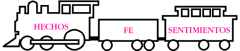 No dependa de sus sentimientos La promesa de la Palabra de Dios, la Biblia, y no nuestros sentimientos es nuestra autoridad. El cristiano vive por fe (confianza) en la fidelidad de Dios mismo y Su Palabra. El diagrama del tren ilustra la relación entre el hecho (Dios y Su Palabra), la fe (nuestra confianza en Dios y en Su Palabra) y los sentimientos (el resultado de la fe y la obediencia) ( San.Juan 14:21). El tren corre con o sin el vagón. Sin embargo, sería inútil tratar de que el vagón mueva el tren. Del mismo modo, como cristianos nosotros no dependemos de los sentimientos o emociones, sino que ponemos nuestra fe (confianza) en la fidelidad de Dios y en las promesas de Su Palabra. Ahora que ha recibido a Cristo En el momento en que usted, en un acto de fe, recibió a Cristo, mediante un acto de su voluntad, muchas cosas ocurrieron, incluyendo las siguientes:
